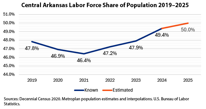 The region continues to develop its role in logistics and transportation. Major shifts in the international trading order have fed recent demand for logistical and warehousing services, and the local area has responded with shovel-ready site availability and a quick approval process. Local labor force participation continues growing, reaching 50 percent of population in 2025. The labor force matched its 2019 pre-Covid peak by 2023 but has continued making gains as a share of population. While low local unemployment rates could suggest a labor shortage, participation growth suggests ambitious firms can find a growing supply of willing workers.