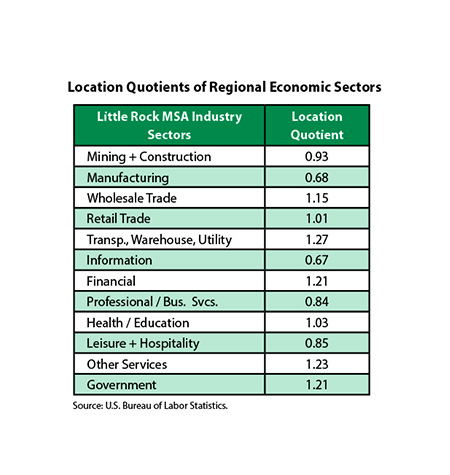 The table at left conveys Location Quotient (LQ) of regional economic sectors, in comparison with the U.S. average. Any LQ score above 1.0 suggests greater-than-average emphasis, while sectors with scores below 1 are smaller than the U.S. average. You can quickly see the region’s highest score is in the Transportation, Warehouse and Utility sectors. It is also above average in the closely related Wholesale Trade sector.