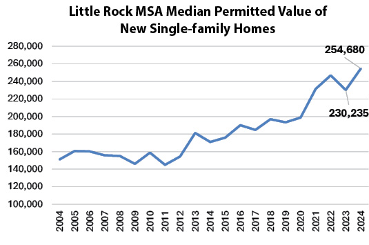 The median value for new homes climbed to $254,680. As always, this is the median value calculated from building permit records; market observation suggests the initial selling price for homes is roughly double the stated permit value. The chart at right depicts new homes by stated value. Maumelle was highest at $389,000, followed by Conway ($335,000) and Little Rock ($305,000). The lowest values – at the permit stage – were found in North Little Rock at $107,881, and Jacksonville at $159,000. These figures reflect local conditions and permitting procedures, sale values run higher and may follow a differing pattern.