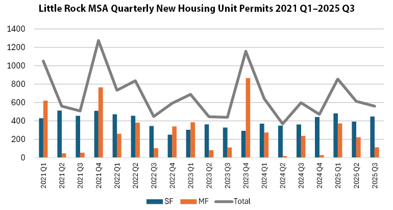 Multi-family construction remains focused in the region’s largest cities, with Little Rock, Conway and North Little Rock leading the pack. In multi-family most cities were down, although North Little Rock saw a big jump mainly boosted by more units at the Pointe North Hills in Lakewood. Little Rock is seeing multi-family growth in its southwest region.
