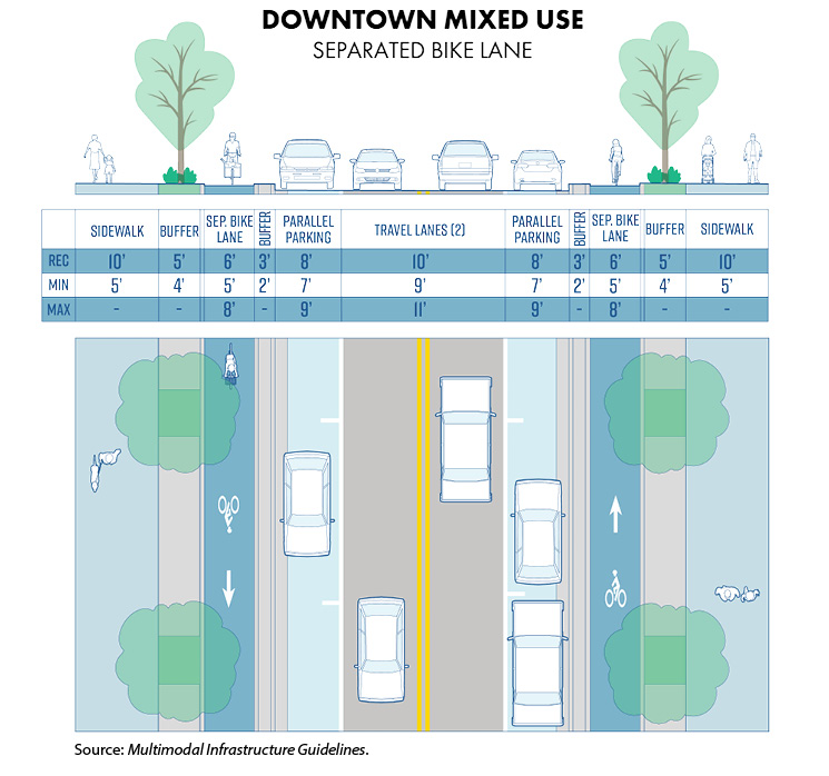 The Multimodal Infrastructure Guidelines establish character corridors that frame how to apply best specific designs for multiple transportation modes regardless of the street classification.