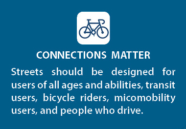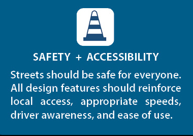 How we build infrastructure must complement each neighborhood’s individual character. A “one-size fits all” approach based on a set “Functional Classification System” does not account for similar type streets, like a major collector, that trace suburban residences versus one that crosses a town center. These two environments look and act very differently. Whereas the suburban collector may attract some pedestrian and bike activity, a town center will be teeming with these users alongside transit and private vehicles. This means the infrastructure adjusts to find the right balance to make it safe and accessible for everyone.