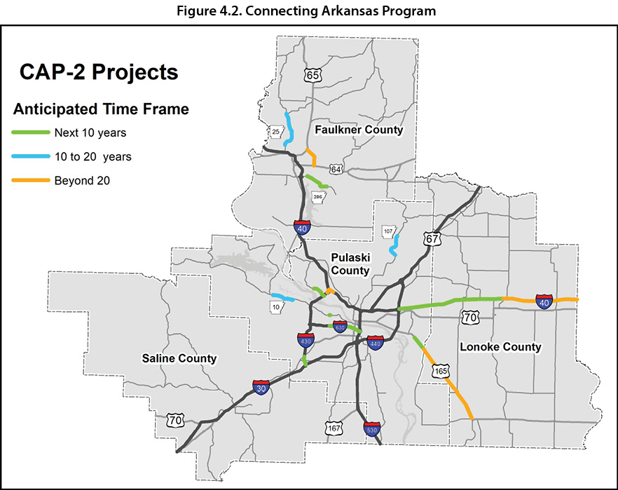 ARDOT has identified several widening projects as part of the Connecting Arkansas Program Phase II. This program is proposed to add travel lanes or address interchange congestion along several freeways and major arterials within Central Arkansas. These projects are shown in figure 4.2. with an estimated time for their completion.